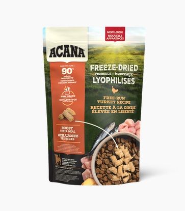 | Ingredients | Turkey with ground bone, turkey giblets (liver, heart, gizzard), whole herring, pumpkin, natural flavour, turkey bone broth, organic butternut squash, organic carrots, organic pears, salt, dried chicory root, turmeric, dried kelp, mixed tocopherols (preservative), vitamins (vitamin E supplement, niacin, thiamine mononitrate, riboflavin, calcium pantothenate, pyridoxine hydrochloride, folic acid, vitamin B12 supplement), minerals (zinc proteinate, copper proteinate), citric acid (preservative), rosemary extract METABOLIZABLE ENERGY: 4200 kcal/kg (105 kcal per patty), with 36% from protein, 7% from carbohydrates, and 57% from fat. ACANA Freeze-Dried Free-Run Turkey Recipe Is formulated to meet the nutritional levels established by the AAFCO Dog Food Nutrient Profiles for All Life Stages, including growth of large size dogs (70 lb. or more as an adult). Analytical Constituents