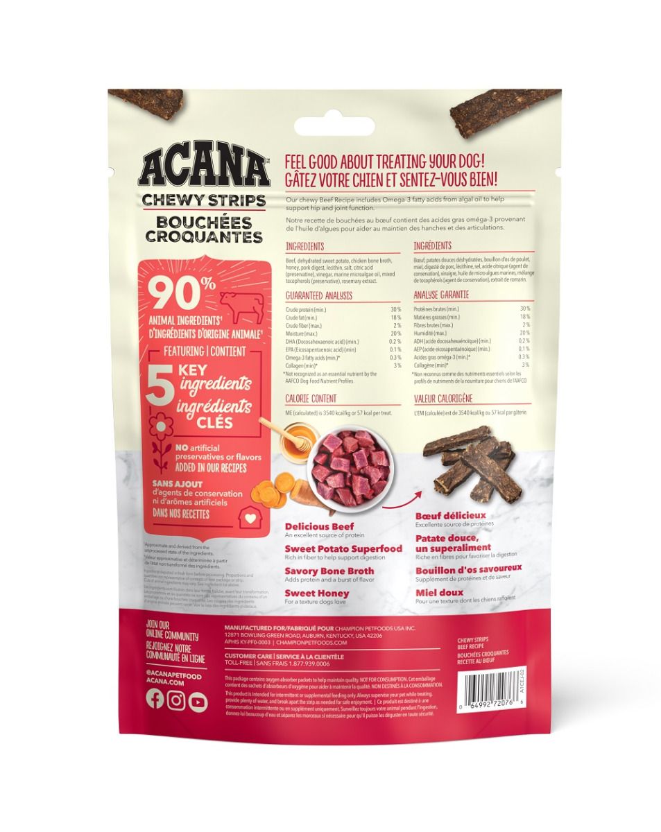 | Ingredients | Beef, dehydrated sweet potato, chicken bone broth, honey, pork digest, lecithin, salt, citric acid (preservative), vinegar, marine microalgae oil, mixed tocopherols (preservative), rosemary extract. ME (calculated) is 3450 kcal/kg, 57 kcal/treat. ACANA High Protein Strips Chewy Beef recipe is intended for intermittent or supplemental feeding only. Treat intake should not exceed 10% of daily caloric intake. Analytical Constituents