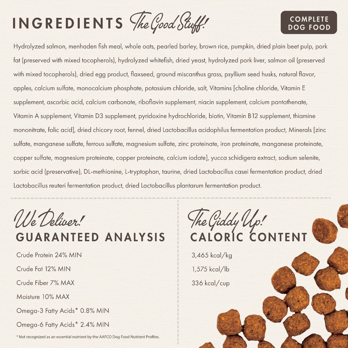 | Ingredients | Hydrolyzed Salmon, Menhaden Fish Meal, Whole Oats, Pearled Barley, Brown Rice, Pumpkin, Dried Plain Beet Pulp, Pork Fat (preserved with mixed tocopherols), Hydrolyzed Whitefish, Dried Yeast, Hydrolyzed Pork Liver, Salmon Oil (preserved with mixed tocopherols), Dried Egg Product, Flaxseed, Ground Miscanthus Grass, Psyllium Seed Husk, Natural Flavor, Apples, Calcium Sulfate, Monocalcium Phosphate, Potassium Chloride, Salt, Vitamins [Choline Chloride, Vitamin E Supplement, Ascorbic Acid, Calcium Carbonate, Riboflavin Supplement, Niacin Supplement, Calcium Pantothenate, Vitamin A Supplement, Vitamin D3 Supplement, Pyridoxine Hydrochloride, Biotin, Vitamin B12 Supplement, Thiamine Mononitrate, Folic Acid], Dried Chicory Root, Fennel, Dried Lactobacillus acidophilus Fermentation Product, Minerals [Zinc Sulfate, Manganese Sulfate, Ferrous Sulfate, Magnesium Sulfate, Zinc Proteinate, Iron Proteinate, Manganese Proteinate, Copper Sulfate, Magnesium Proteinate, Copper Proteinate, Calcium lodate], Yucca Schidigera Extract, Sodium Selenite, Sorbic Acid (Preservative), DL-Methionine, L-Tryptophan, Taurine, Dried Lactobacillus casei Fermentation Product, Dried Lactobacillus reuteri Fermentation Product, dried Lactobacillus plantarum fermentation product