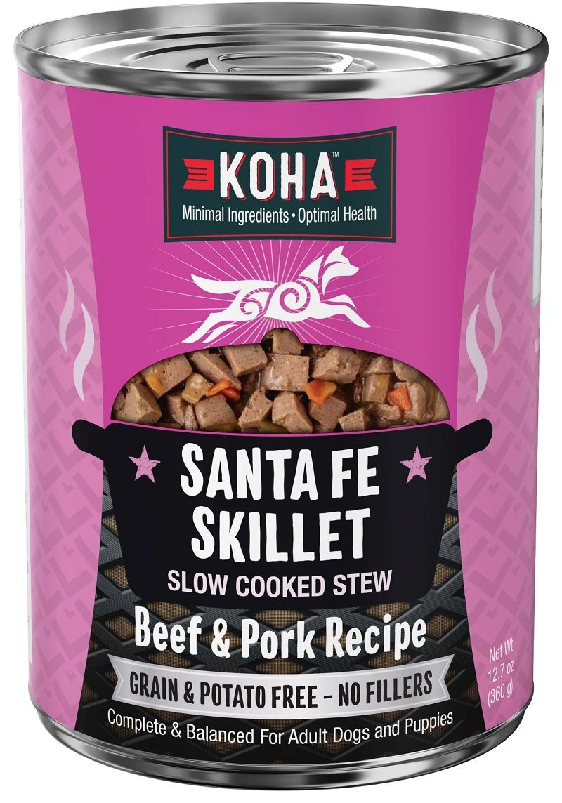 KOHA SANTA FE SKILLET SLOW COOKED STEW BEEF & PORK RECIPE DOG FOOD is formulated to meet the nutritional levels established by the AAFCO Dog Food Nutrient Profiles For Growth and Maintenance including growth of large size dogs (70 lbs. or more as an adult). Made in USA.