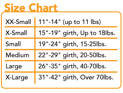 XX-Small size fits dogs with a 11" - 14" girth, >6" in length and up to 11 pounds in weight. Girth measurements reflect the area around the widest part of the dog's rib cage.