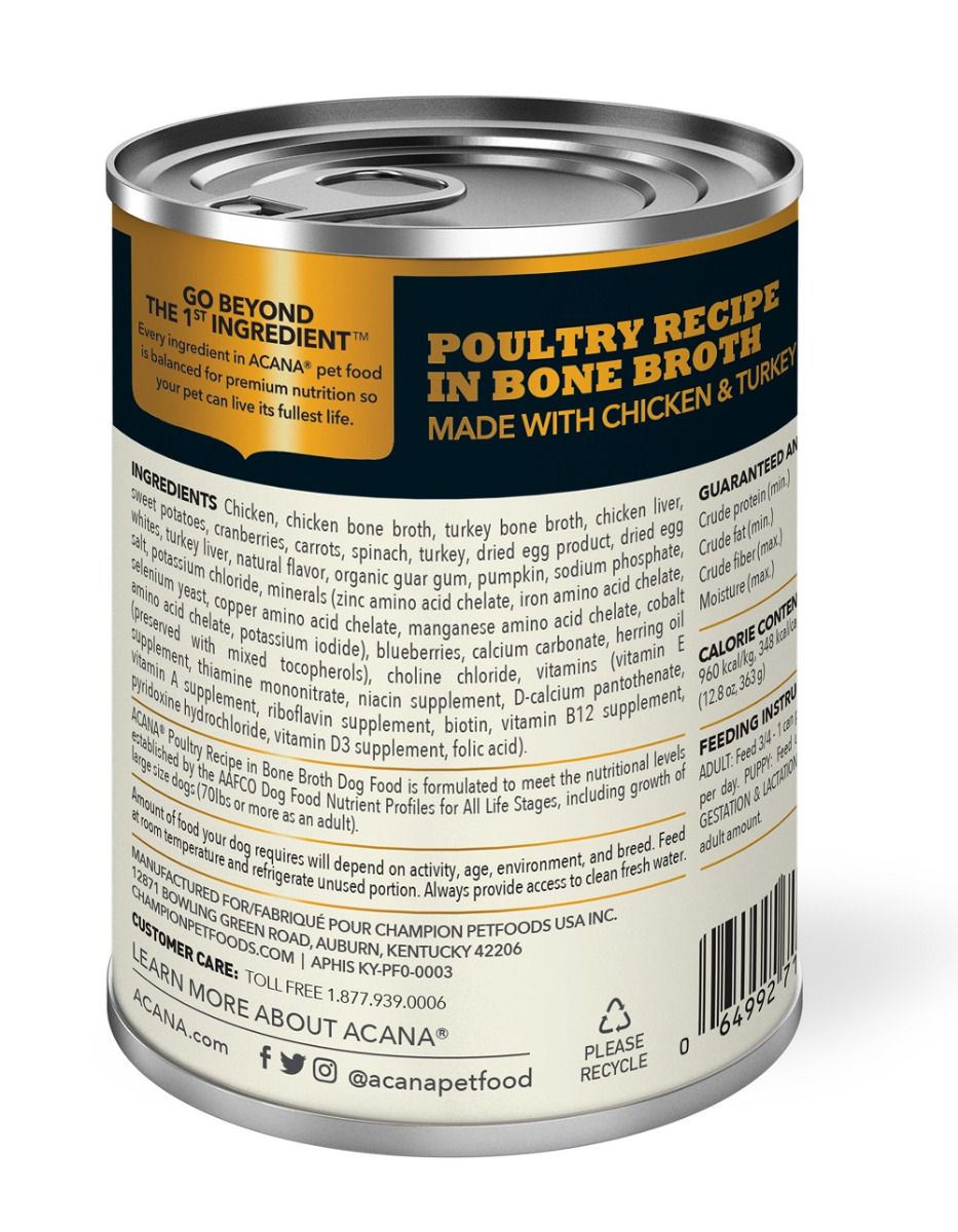 | Ingredients | Chicken, chicken bone broth, turkey bone broth, chicken liver, sweet potatoes, cranberries, carrots, spinach, turkey, dried egg product, dried egg whites, turkey liver, natural flavor, organic guar gum, pumpkin, sodium phosphate, salt, potassium chloride, minerals (zinc amino acid chelate, iron amino acid chelate, selenium yeast, copper amino acid chelate, manganese amino acid chelate, cobalt amino acid chelate, potassium iodide), blueberries, calcium carbonate, herring oil (preserved with mixed tocopherols), choline chloride, vitamins (vitamin E supplement, thiamine mononitrate, niacin supplement, D-calcium pantothenate, vitamin A supplement, riboflavin supplement, biotin, vitamin B12 supplement, pyridoxine hydrochloride, vitamin D3 supplement, folic acid). (ME CALCULATED) 960 kcal/kg, 348 kcal/can (12.8oz, 363g) ACANA Poultry Recipe in Bone Broth Dog Food is formulated to meet the nutritional levels established by the AAFCO Dog food Nutrient Profiles for all Life States, including growth of large size dogs (70 lbs or more as an adult). Analytical Constituents