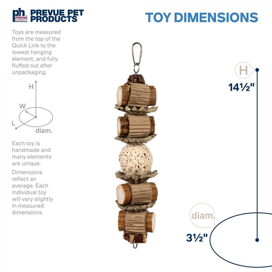 Naturals™ Lumberjack Stack #60263 Bird Toy from Prevue Pet Products is a versatile and engaging toy designed for small to medium-sized birds, such as parakeet and cockatiel. This toy is meant to provide both physical and mental stimulation to keep your bird entertained and active. It offers various elements such as moving parts, balancing challenges, manipulative components, and materials for chewing. Engaging with these different aspects of the toy can contribute to your bird's overall well-being, both physically and mentally. Lumberjack Stack contains many moving parts held together on a stainless steel wire. Materials include corrugated paper strips, sunflower stalk chunks, a sola ball for foraging, folded palm leaf flowers and a mahogany pod. Measures approximately 3 1/2" long by 3 1/2" wide by 14 1/2" high. Since the toys are handmade, there might be slight variations in shape and size. Regularly inspect the toy for any signs of wear or damage, and replace it when it's used or worn out to ensure your bird's safety and continued enjoyment.