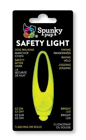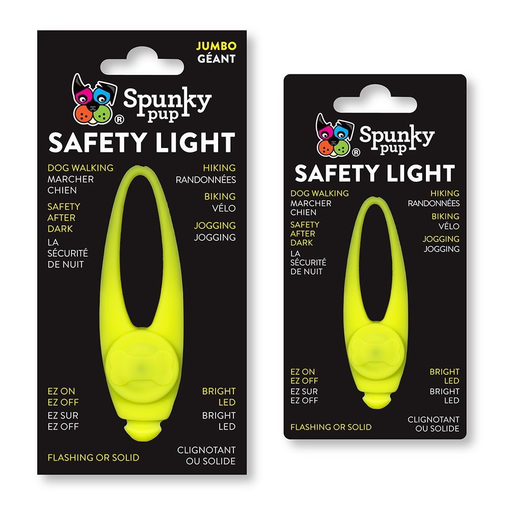 The Flash & Glow Safety Light is perfect to keep you and your dog safe on night time walks. Attach this bright, colorful LED to you or your dog to be seen from a distance. Just wrap the durable, silicone light around your dog’s collar or leash or your shoe laces, belt loop, backpack/bag/purse, almost anything you can stretch the light around. Use as a safety light for kids too or get creative and wear as a fun, flashing accessory! Easy push-button with 3 modes: Blinking, Flashing and Solid. Fun neon colors. For use with dogs of any size. Not for use as an animal toy. The Jumbo size flash & glow safety light by Spunky Pup is great for dogs with larger collars.