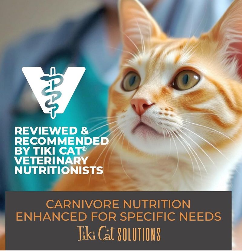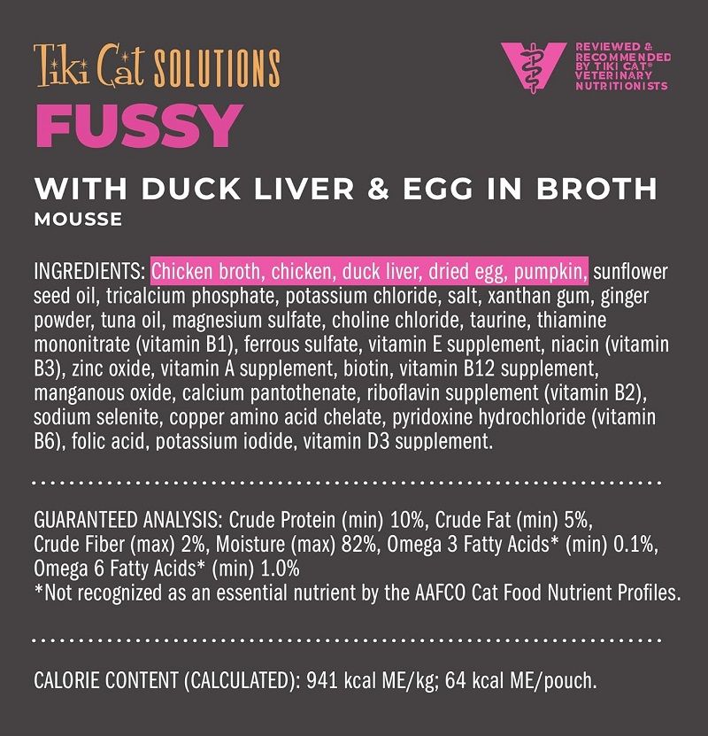 Encourages Picky Cats to Eat. All cats are born carnivores, but some have special nutritional needs. Tiki Cat® Solutions™ Fussy Mousse encourages picky cats to eat with an enticing aroma and palatable blend of real chicken, duck liver, and egg. Gentle fiber from pumpkin supports digestion. The added moisture in wet food can help compensate for cats' naturally low thirst drive. Reviewed and recommended by Tiki Cat® Veterinary Nutritionists.