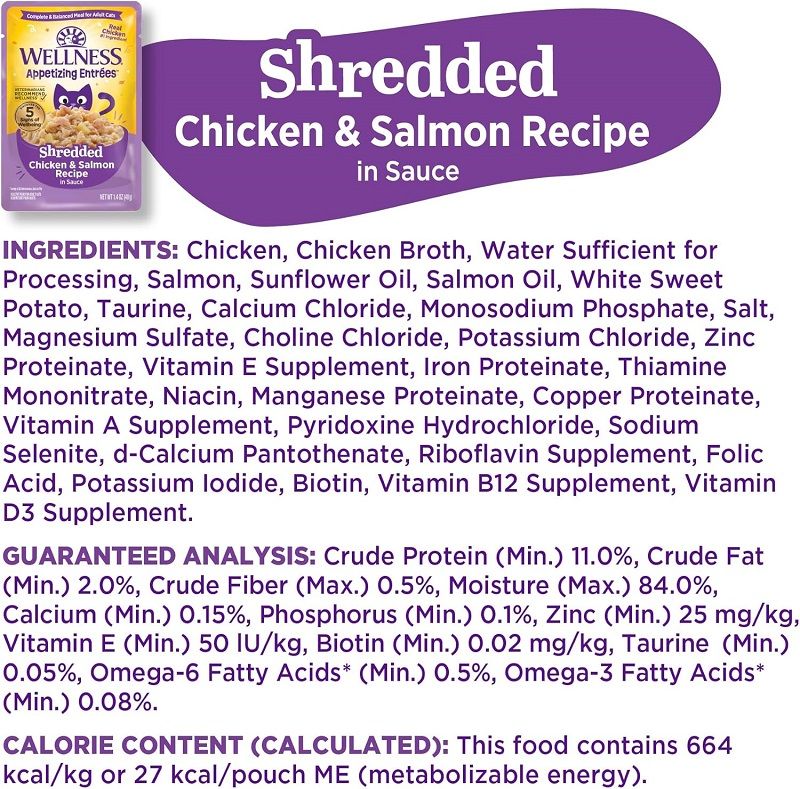 Wellness Appetizing Entrees Shredded Chicken and Salmon In Sauce Recipe Cat Food Pouches - 8 x 1.4oz